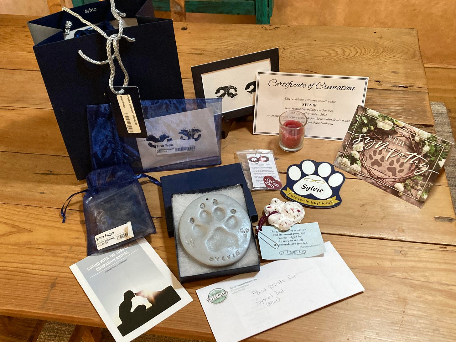 Two weeks later, I returned to the hospital to collect Sylvie’s ashes. The plan was not to cremate Sylvie; I had imagined a scenario in which we returned to my home in New Mexico and she would pass here in the mountains. When the time came, our local vet, Dr. Ted, would come to our house and put her to sleep. My friend Mollie and I would bury her in the back of my property next to a huge boulder that we used to sit on. Instead, I was handed a dark blue bag that contained her ashes (I despise the portmanteau “cremains”) and the “grief kit.” Here is a photo of the bag and its contents.