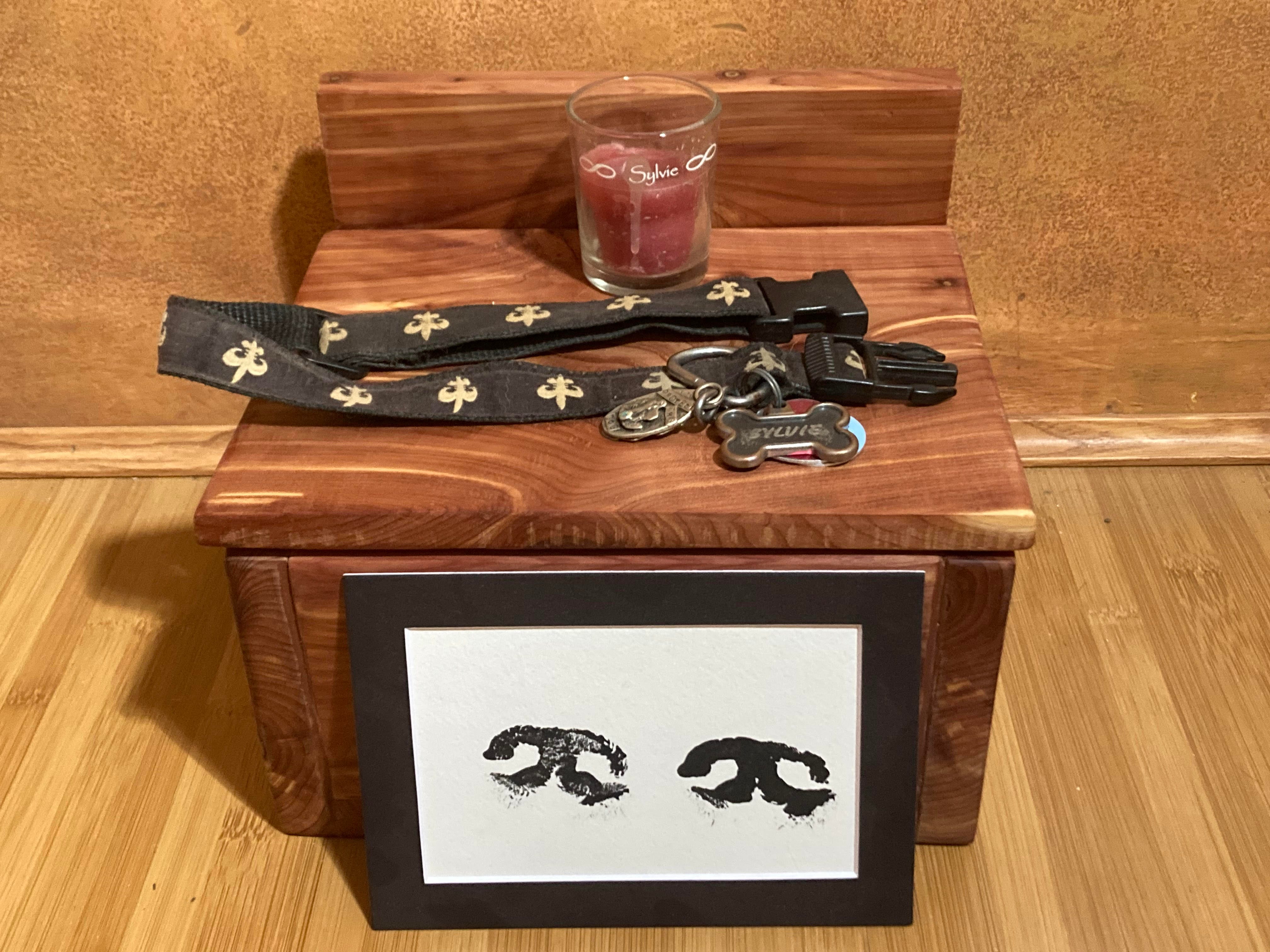 A few weeks ago, I asked my friend and carpenter, Andrew, to build a small box for Sylvie’s ashes. He built Sylvie a cedar box, from local wood, and rubbed it with linseed oil; the grain shimmers and the aroma fills the room.